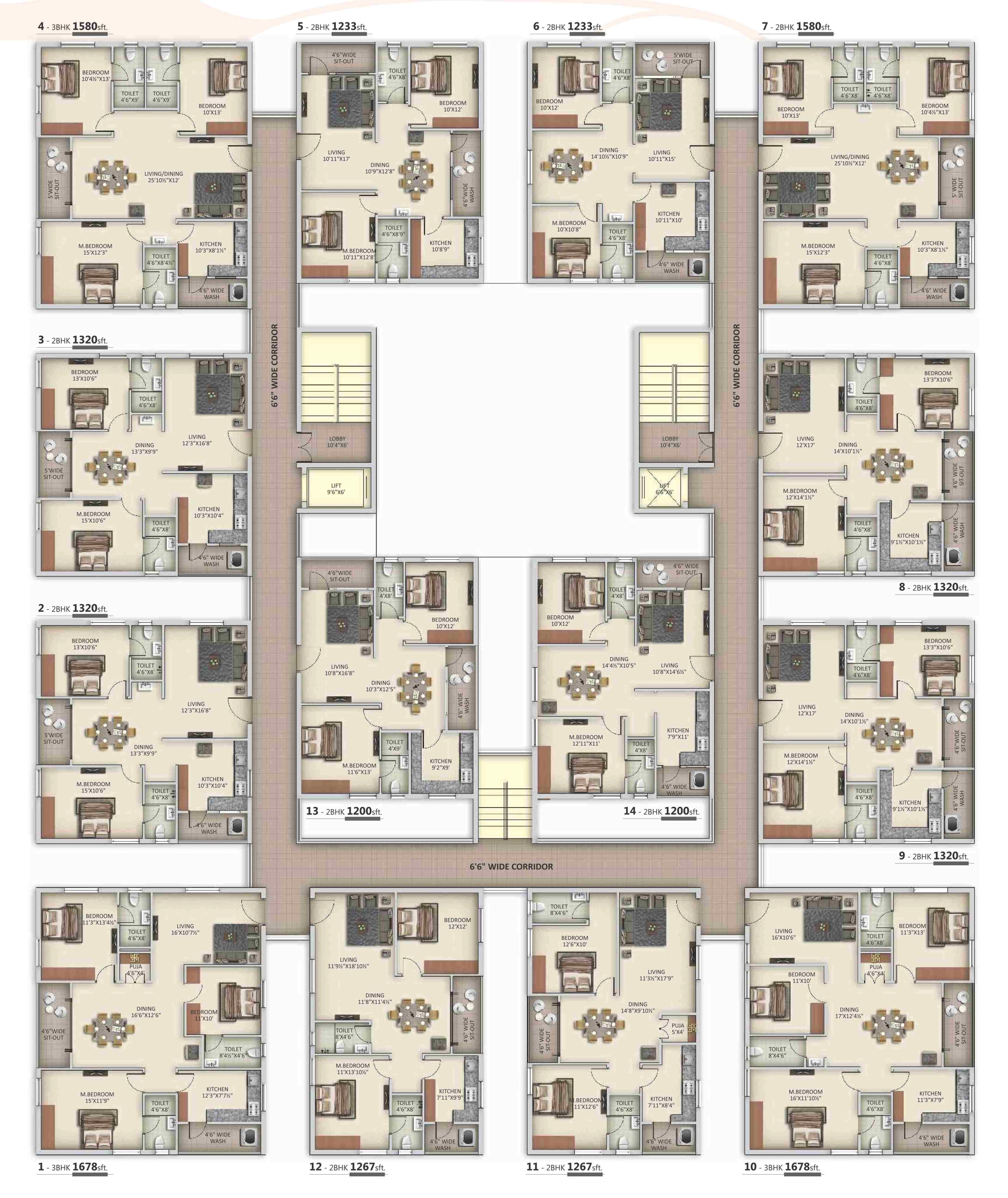2×2 vitrified tiles in hall, dinning and remaining bedrooms of premium make. Rustic ceramic tiles in balconies glazed ceramic tile dado upto 6′ height in all bathrooms of reputed brand.